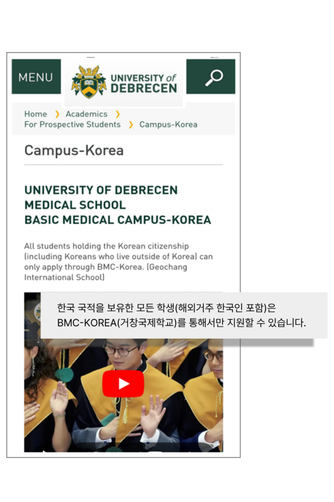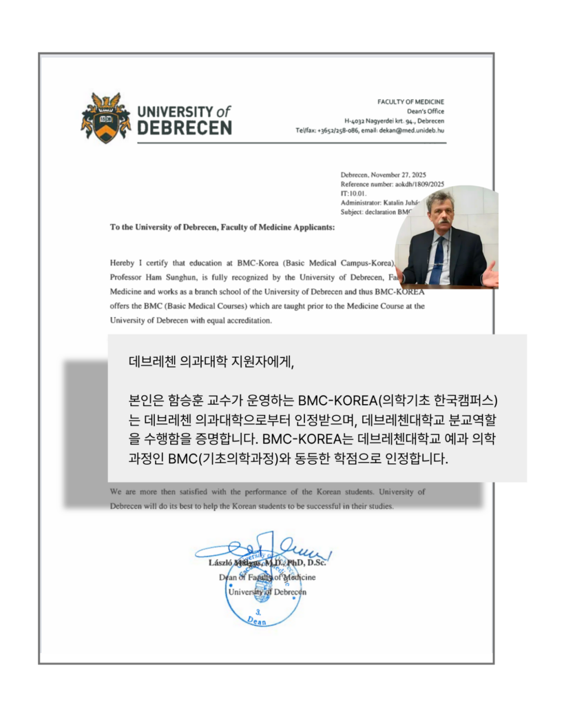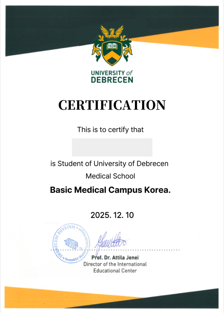 한국에서는 오직 데브레첸대학교 의학기초과정 한국캠퍼스(BMC-KOREA) 출신만 본과 입학이 허용됩니다.