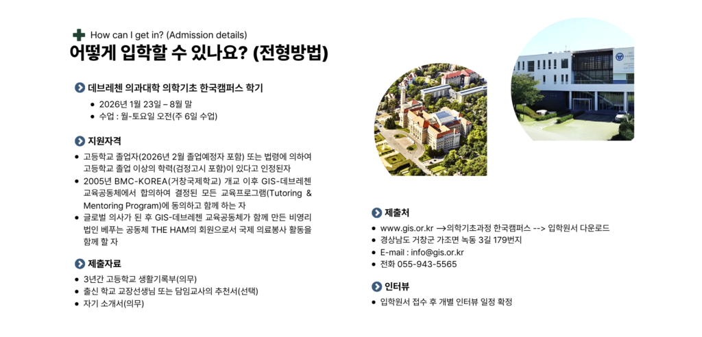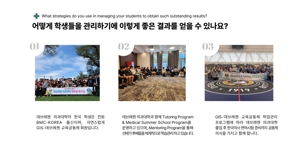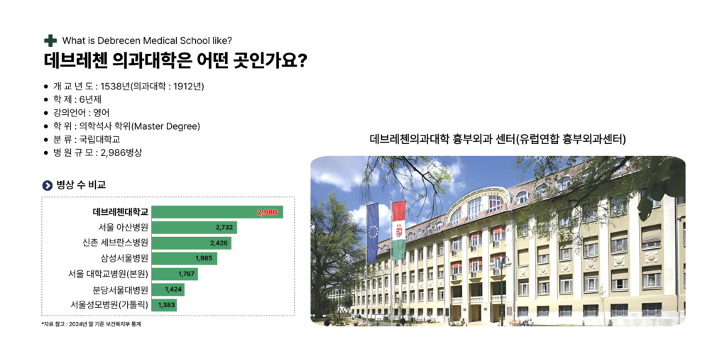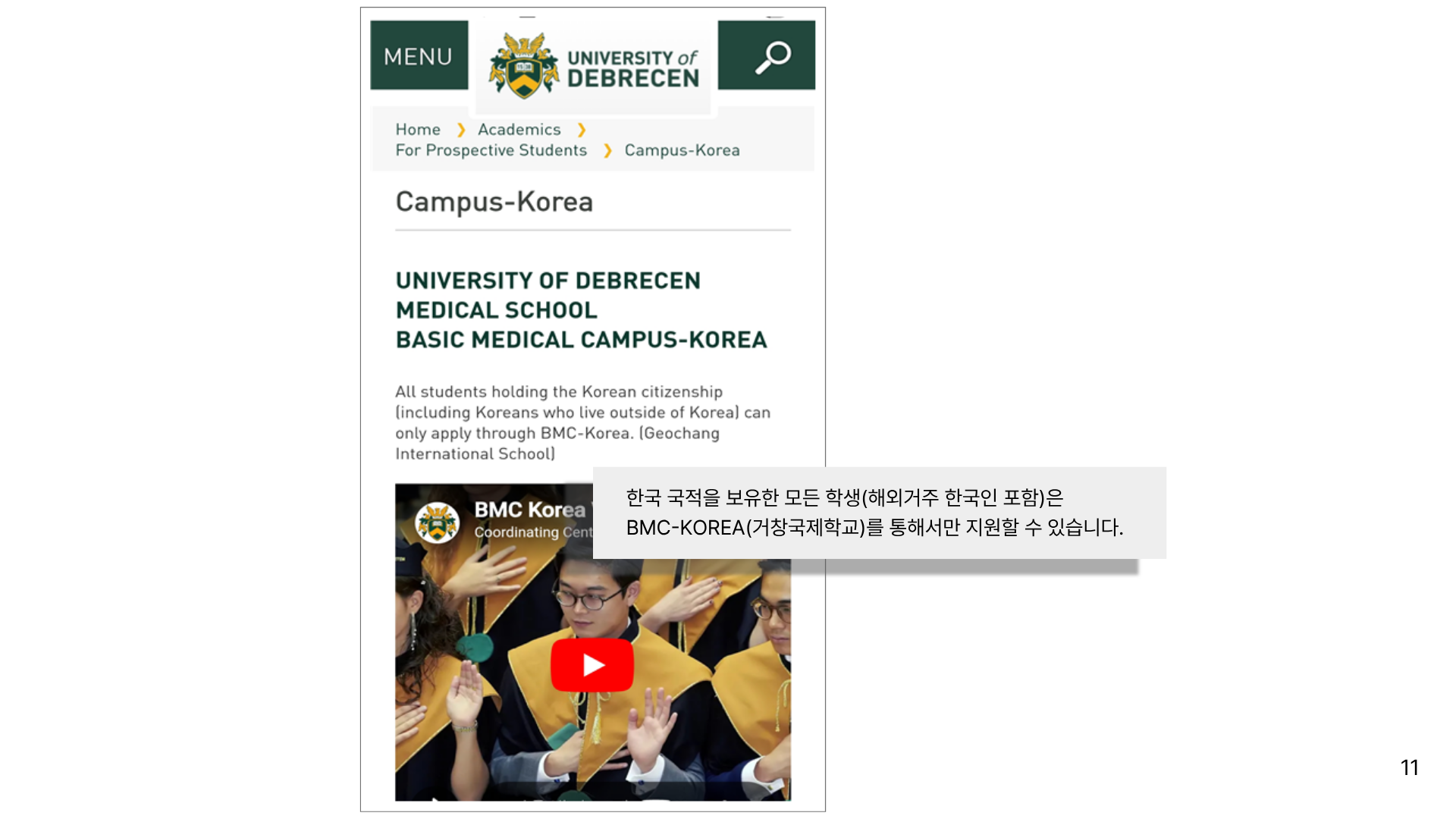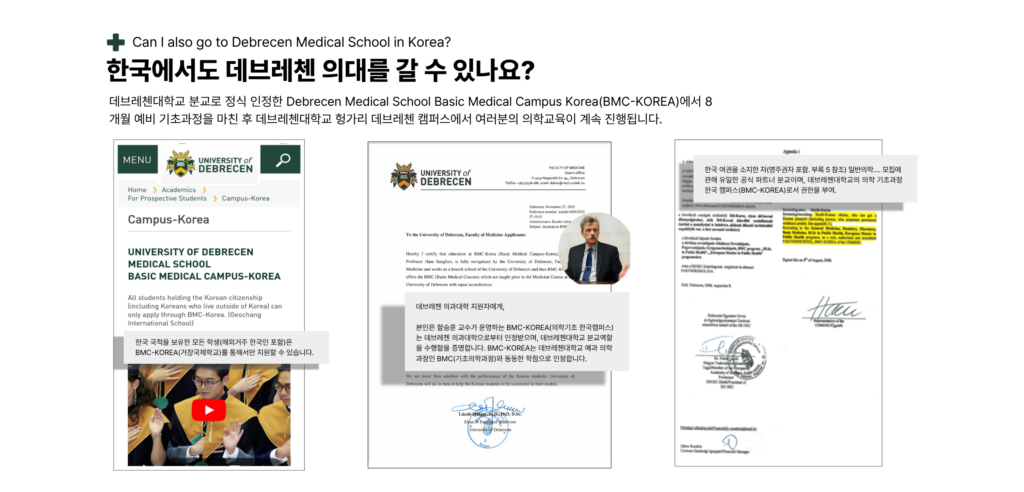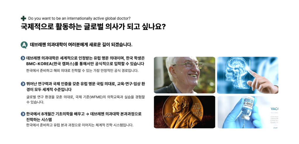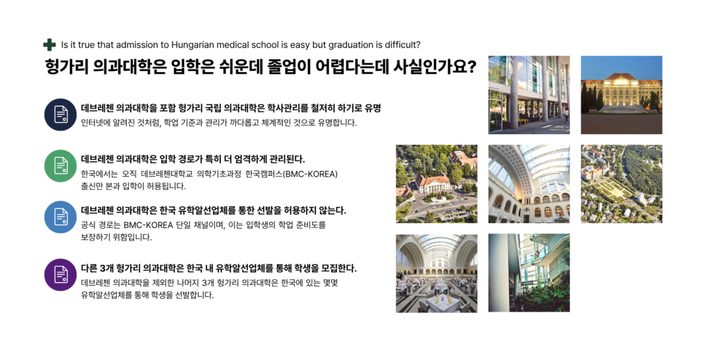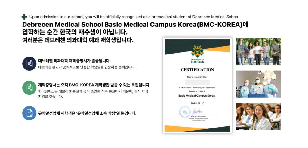 데브레첸 의과대학 The Medical University of Debrecen in Hungary is internationally certified as a six-year medical course in English,It is an international medical school with clinical practice-oriented education and advanced research environment. 한국 국적을 보유한 모든 학생(해외 거주 한국인 포함)은 BMC-KOREA(거창국제학교)를 통해서만 지원이 가능합니다. 진로 설계 안내 It’s a decision to choose your child’s future, not ‘school choice’. WHERE TO GO Gallery 함승훈 교장 공로상 수상 데브레첸대학교 공로상 신입생 축제